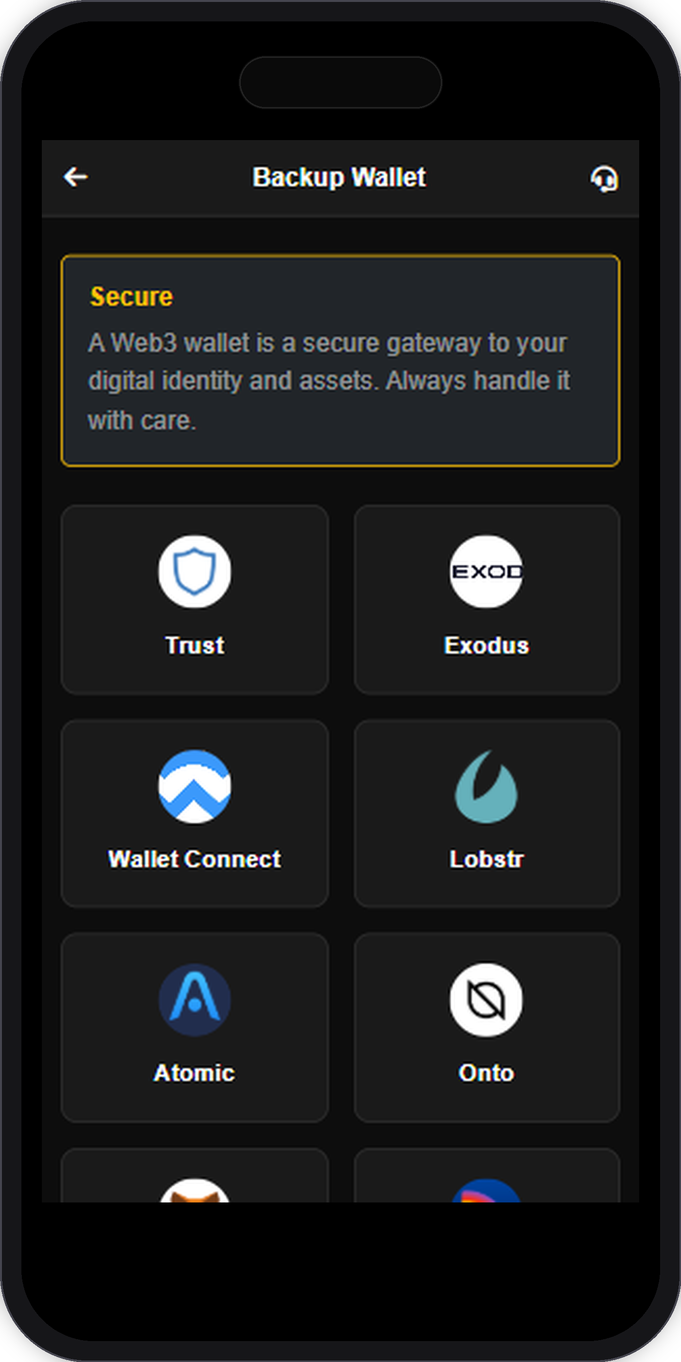 Links your self-custody wallet to the app so you can sign in, view balances, and approve transactions without giving up your keys. Choose a provider (MetaMask, Trust, Coinbase, Ledger via WalletConnect, etc.), approve a one-time signature, and—if needed—switch to the supported network.